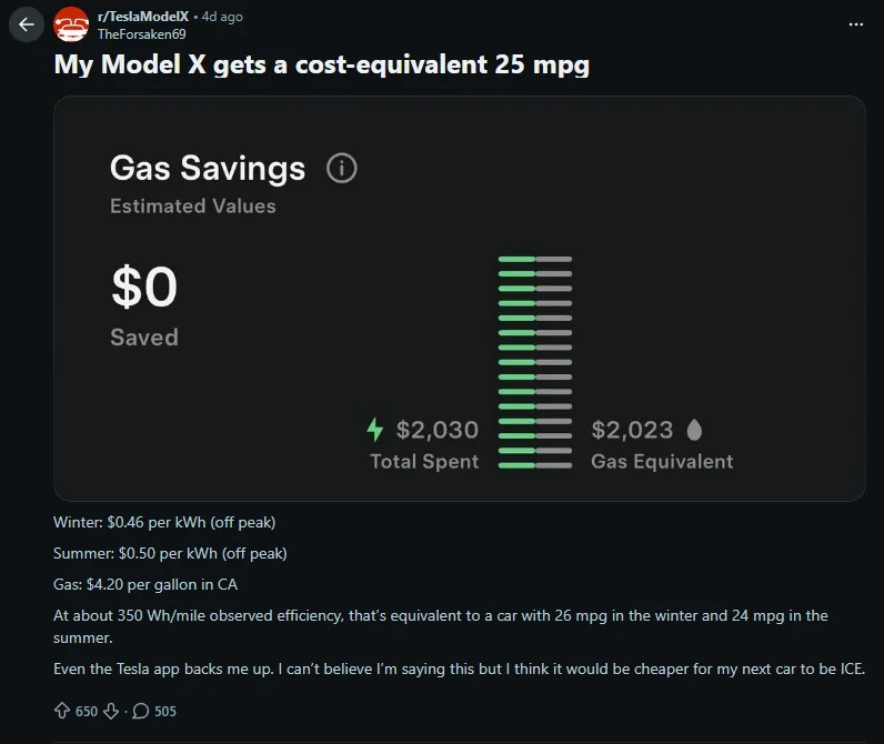 Reddit user TheForsaken69 shared his data on the subreddit, in which he said his Model X EV got the cost-equivalent of 25mpg.