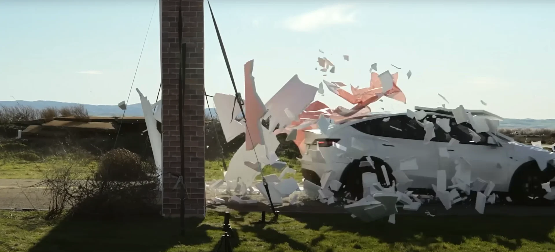This time around, there was no birds and no coyotes – just a Tesla Model Y on autopilot and a wall with a sheet draped over it.