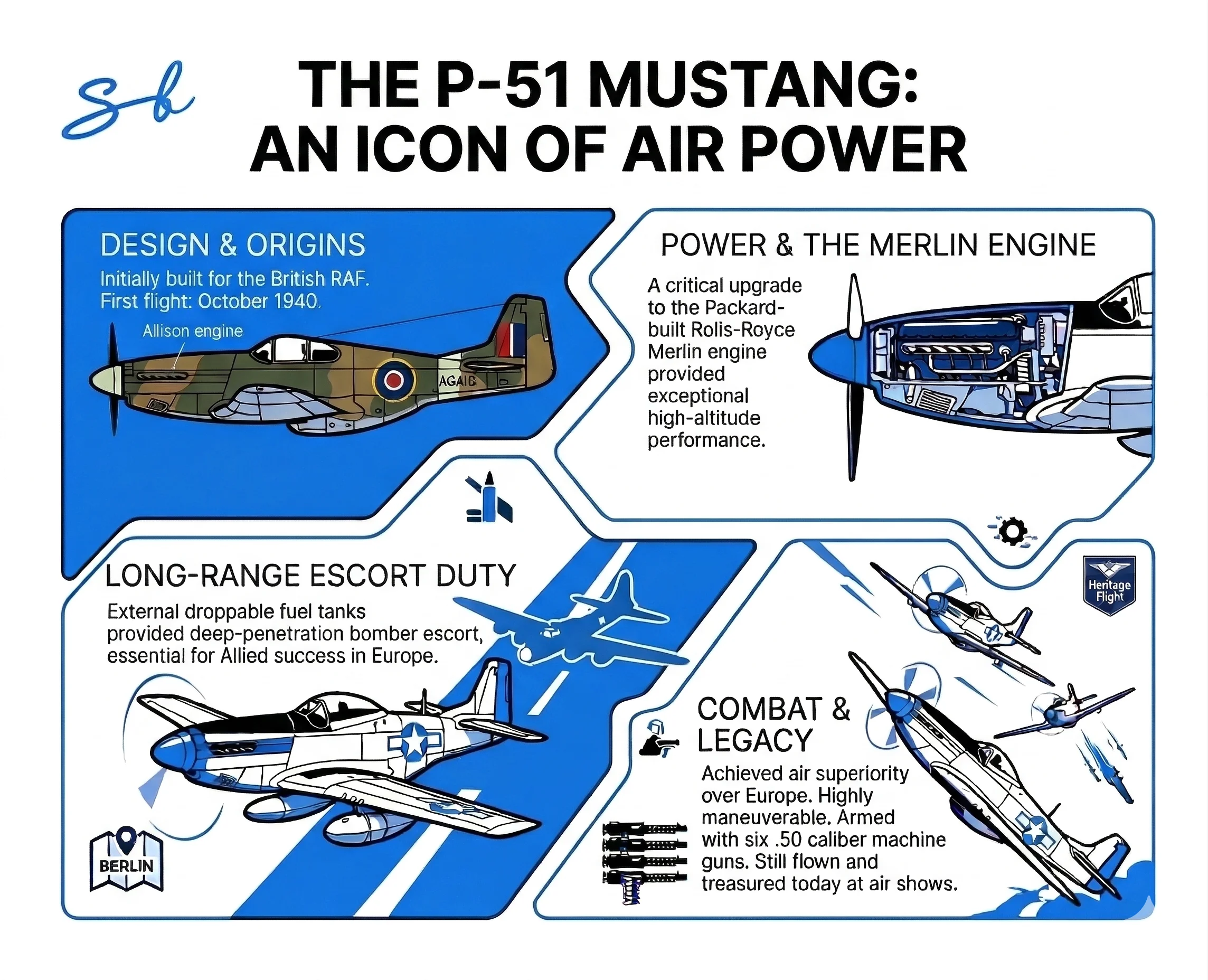 The Mustang was powered by a Rolls-Royce Merlin engine, and many argue it was the best fighter of World War II.
