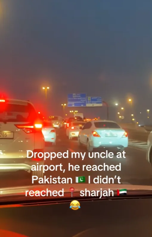 He later explained that his uncle’s flight from Sharjah – which runs about two to three hours – had already landed in Pakistan while he remained trapped in traffic.