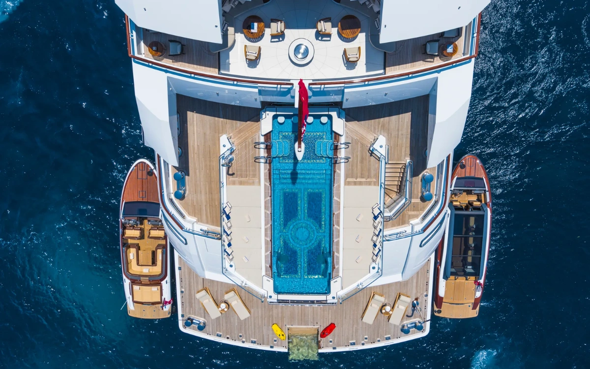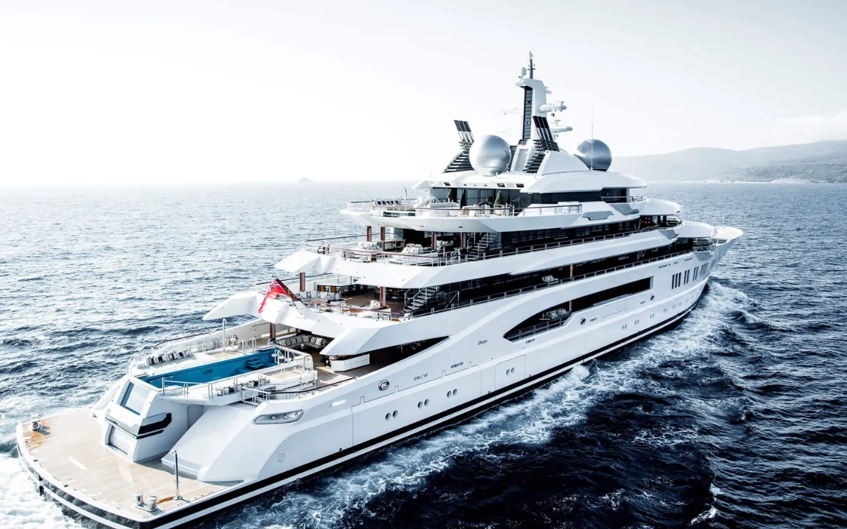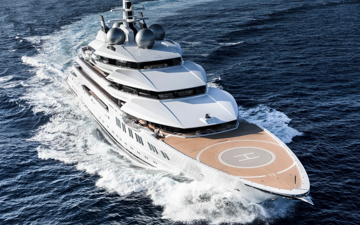 Spread across six decks, the vessel features an infinity pool, a Jacuzzi, twin spas, a private cinema, and a helicopter pad.