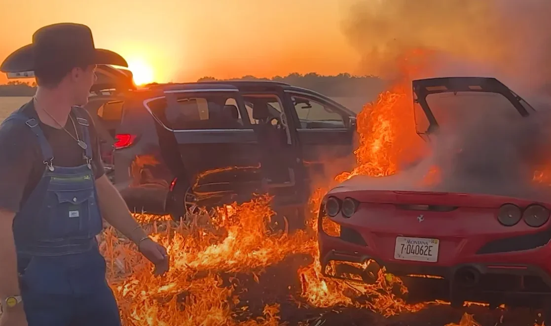 After initially buying the Ferrari F8 Tributo in 2023, he decided to set fire to it in a field, which isn’t an illegal action in itself.