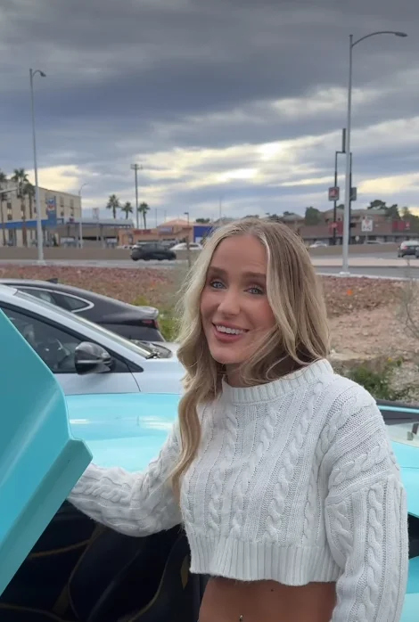 A young supercar fan was approached during a street interview after the host noticed her gorgeous blue Lamborghini Aventador S and asked what she did for work.