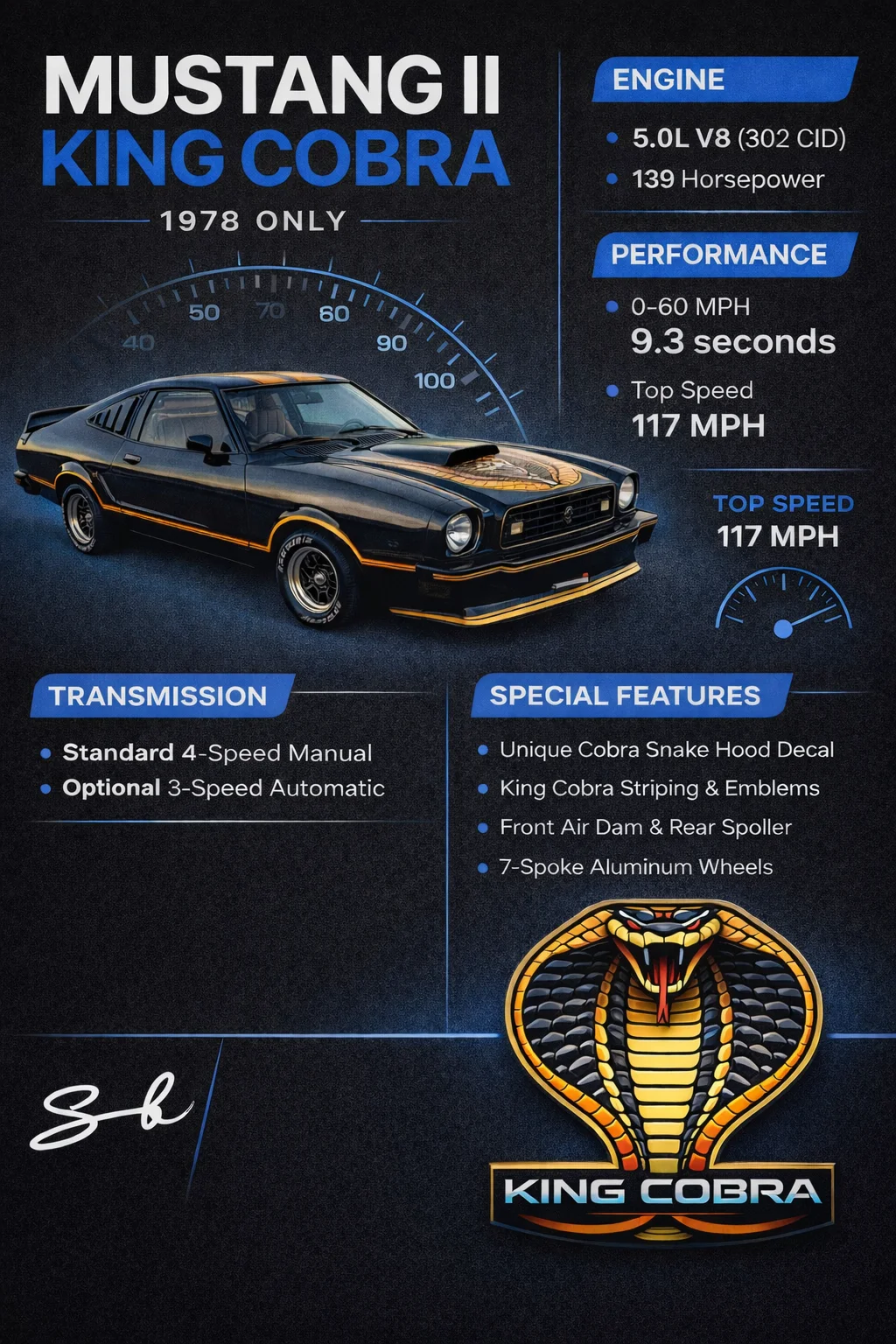The King Cobra package came with adjustable shocks and deep front air-dam, and a V8 under the hood.